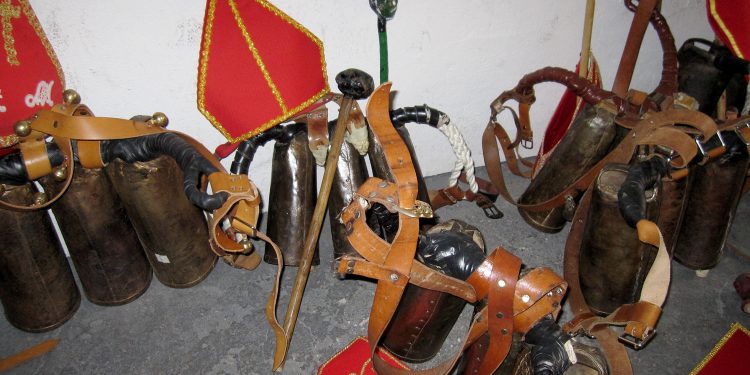 Los medios de comunicación andan ahora entrevistando a Aniceto, el Diablo Mayor, el jefe, mientras en una esquina, un puesto ambulante de churros ofrece chocolate caliente. La Endiablada, como aquí se le conoce a los diablos, hace un rato ha terminado su función de ronda petitoria por las casas del pueblo y en estos momentos descansan. En el salón donde tienen su sede, aparcan su ruido los cencerros y se guardan igualmente las oferentes porras hasta el momento de la procesión en la que cobrarán protagonismo unidos al cuerpo de cada diablo.