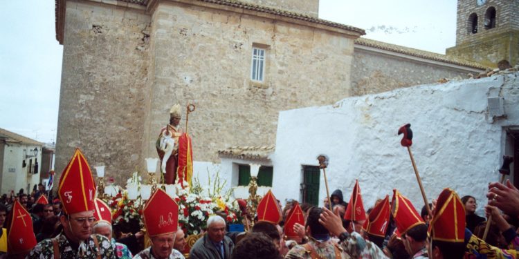 Los «diablos» abren camino delante de la imagen de San Blas, en dos filas, a los lados de la calle. Ninguno lleva hoy máscara, pero sí la porra con alguna figura extraña (ya comentada), en uno de sus extremos, que continuamente agitan en sus manos. Todo parece tranquilo. Así se hará el recorrido, bueno, así hasta que, en un instante, un diablo se dará la vuelta y empezará a saltar en dirección a la imagen, llevando los brazos extendidos, en una especie de ofrecimiento, los ojos fijos en el Santo protector, hasta llegar a apenas medio metro de la carroza donde se encuentra; detrás, lo hacen igualmente otros compañeros formándose una singular columna de cuerpos, brazos, colores y sonidos que sobrecogen a quienes la presenciamos. Después, la calma. Un, dos, tres, repetir paso por salto, un, dos, tres, repetir paso por salto…, cencerros, brazos extendidos, salmodia de monotonía que a la vez es ofrenda de devoción.