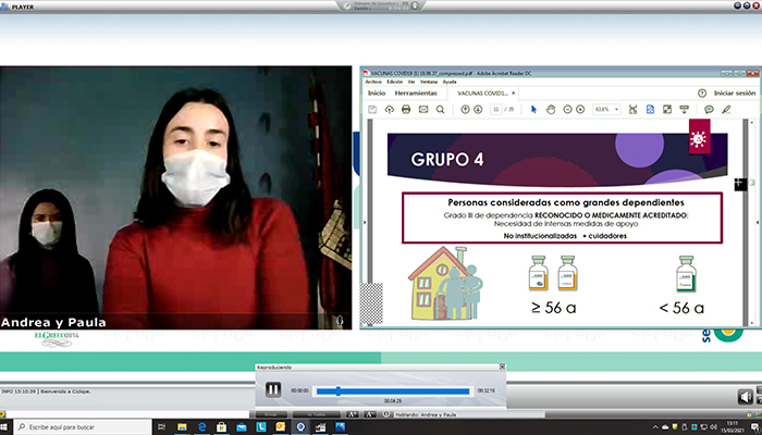 Por último, las residentes de Enfermería han repasado las posibles reacciones adversas, la vacunación de las personas con infección con SARS-CoV-2 o de las que han pasado el Covid-19 y han ofrecido recomendaciones generales en relación con la vacunación informando que no es obligatoria, que la pauta completa se realiza con las misma vacuna o que las personas desplazadas recibirán la segunda dosis en el lugar donde se encuentren desplazados.