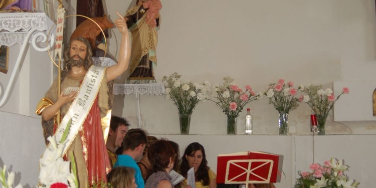 El campanil anuncia la inmediata puesta en marcha de la procesión. El sol con su calor del mediodía se une a este paseo en el que no falta el alcalde pedáneo Agustín, al que acompaña Angustias, la concejal capitalina responsable de la relación con los barrios conquenses; también, y a título personal, veo al Delegado de Turismo, José María Pastor, pues su madre es de Colliguilla. Agustín me comenta, que no existen datos para saber como se introduce el patronazgo de San Juan Bautista en el pueblo, “existe desde siempre”, me indica, “aunque no nos falta agua cercana, el Júcar, y una fuente a la salida del pueblo, donde eso sí, los mayores recuerdan que iban las mozas a lavarse la cara bien temprano, al amanecer del día 24 pasado…”